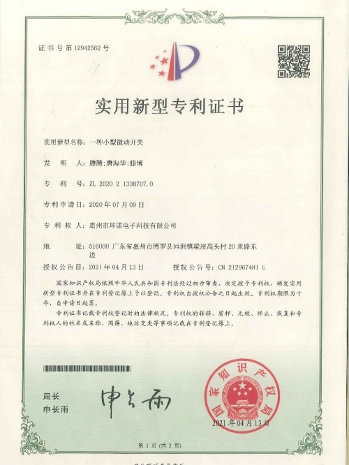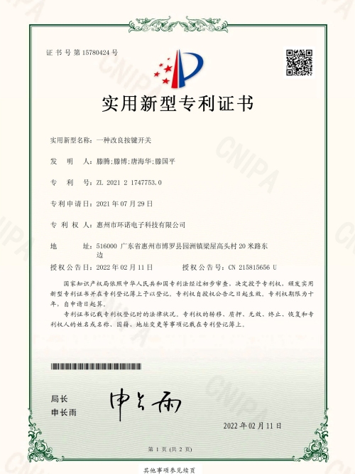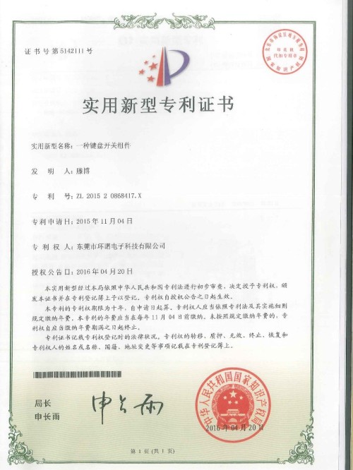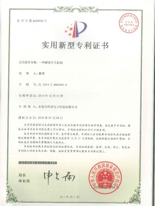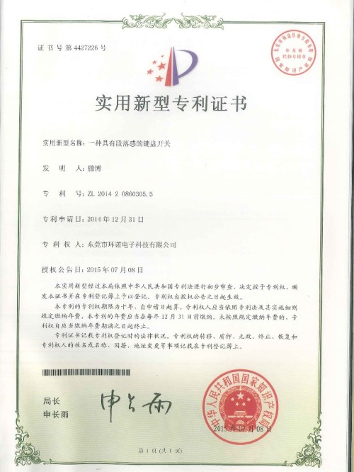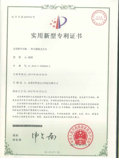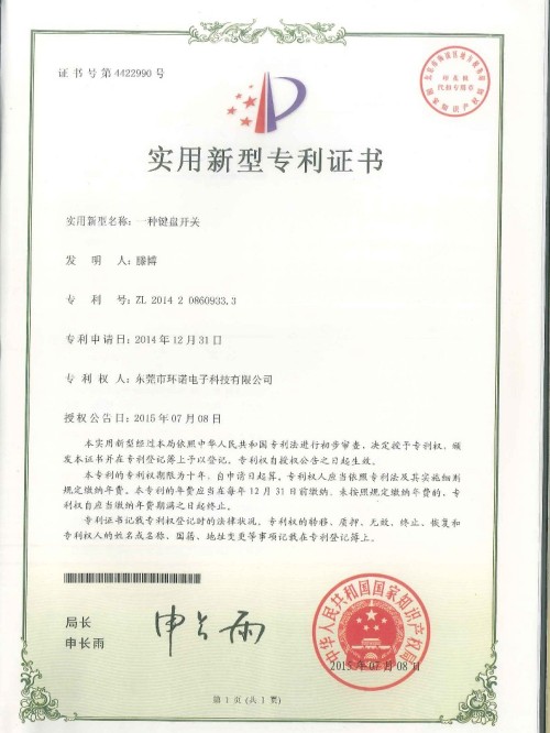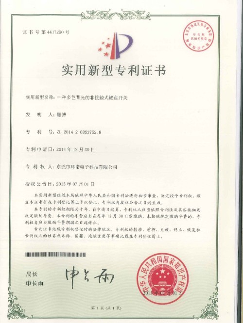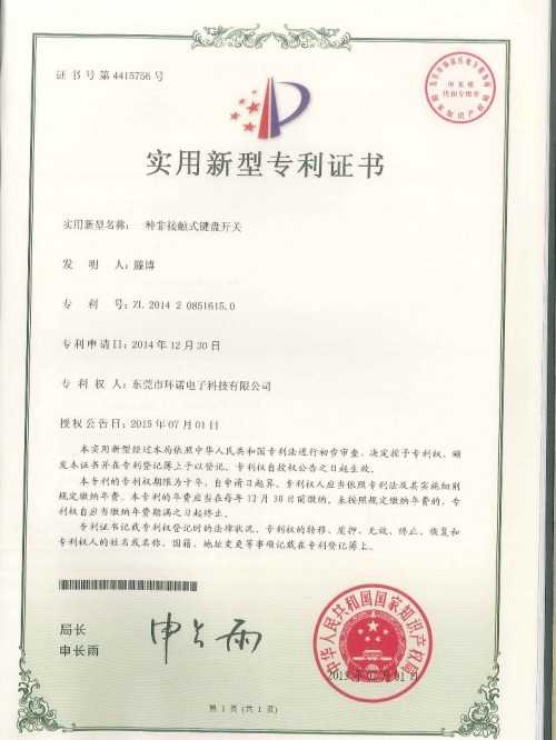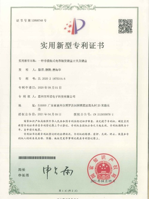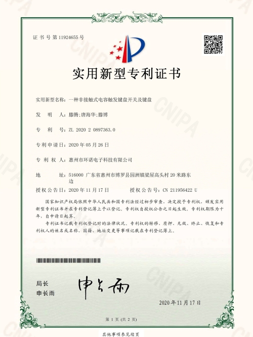 一种非接触式电容触发键盘开关及键盘-实用新型专利证书(签章)